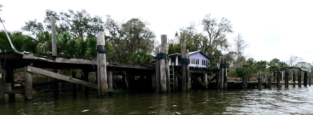 Although the Apalachicola River is a wide and fast flowing river there are hundreds of house boats tied up along side it’s banks. Homemade, manufactured, houseboats of all shapes and sizes can be seen here. We did encounter a floating dog kennel complete with a number of deer hounds which could be heard for miles up and down the river as we approached.