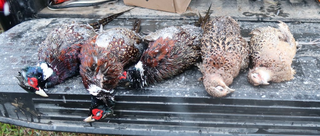 We hunted early one morning. The rain on Lake Michigan had turned to snow further inland and the wind was howling. We hunted over corn rows using two highly trained Brittany Spaniels who knew their business. They located and flushed these pheasants who fell to 20ga shotguns loaded with #5 high brass shells. These birds will be enjoyed with gravy over rice and yes, that is snow on the birds and on the tailgate! It was COLD!
