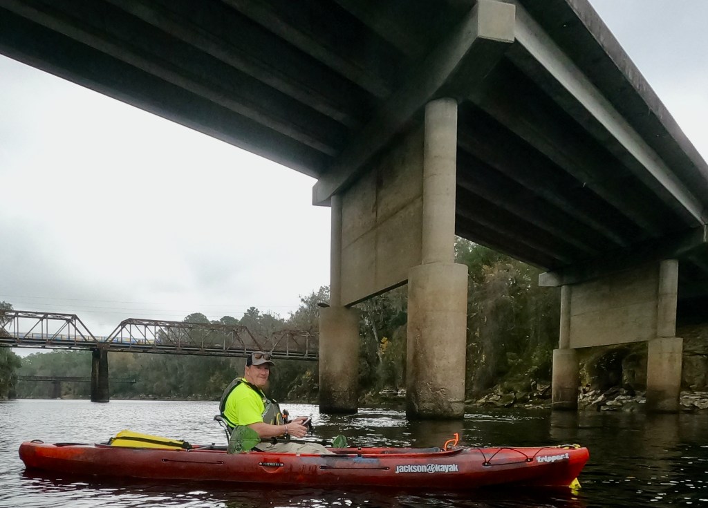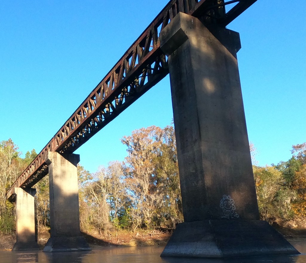 Day 1 awaits!Jay waters up for the day ahead! Mark makes some final adjustments before heading out! This old railroad trestle stands as a reminder of days long gone. This old trestle is one of several we will paddle under. Edward settles in for a day of paddling! The Suwanee River is lined with beautiful limestone formations. The river was very low which exposed the lower portions of the formations. Limestone! With the river level being so low, many of the springs alongside the riverbanks were exposed and flowing into the river. Often they gave themselves up by the noise they make long before they were seen! Rick and Edward discuss the finer points of paddling techniques such as “feathering” the paddle! Old bridges span the river.Mark takes a break under a bridge! The day 1 morning rains finally left and the afternoon was beautiful! Day 1 ended at the Dowling Park River Camp.
