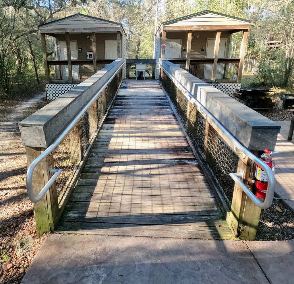 Bucky exits the river and takes off! Sorry for the poor image but Bucky wasn’t waiting around for photo ops! Cypress Knees! This suspension bridge spans the Suwanee! Mark paddles out of a beautiful spring!Dive platform over a riverside spring! Day 2 ended at Peacock Slough River Camp. Deluxe accommodations await! This pavilion at Peacock Slough was the paddlers dining hall. Like the other River Camps Peacock Slough is only accessible by river. Day 2 comes to a close.