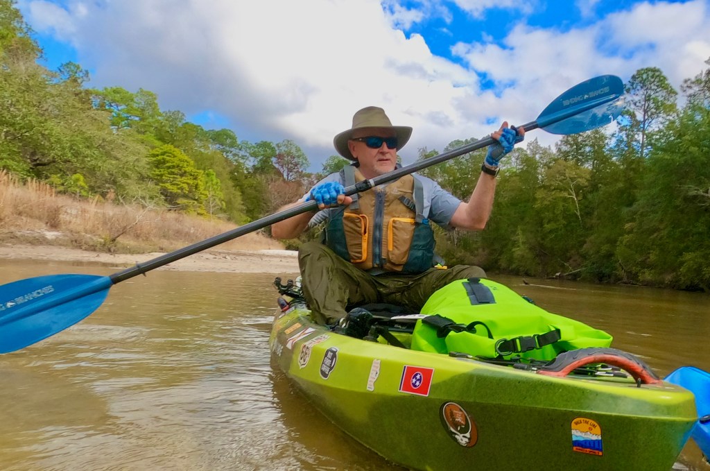 Mark Wheeler crosses a land bridge near Alford Greenway