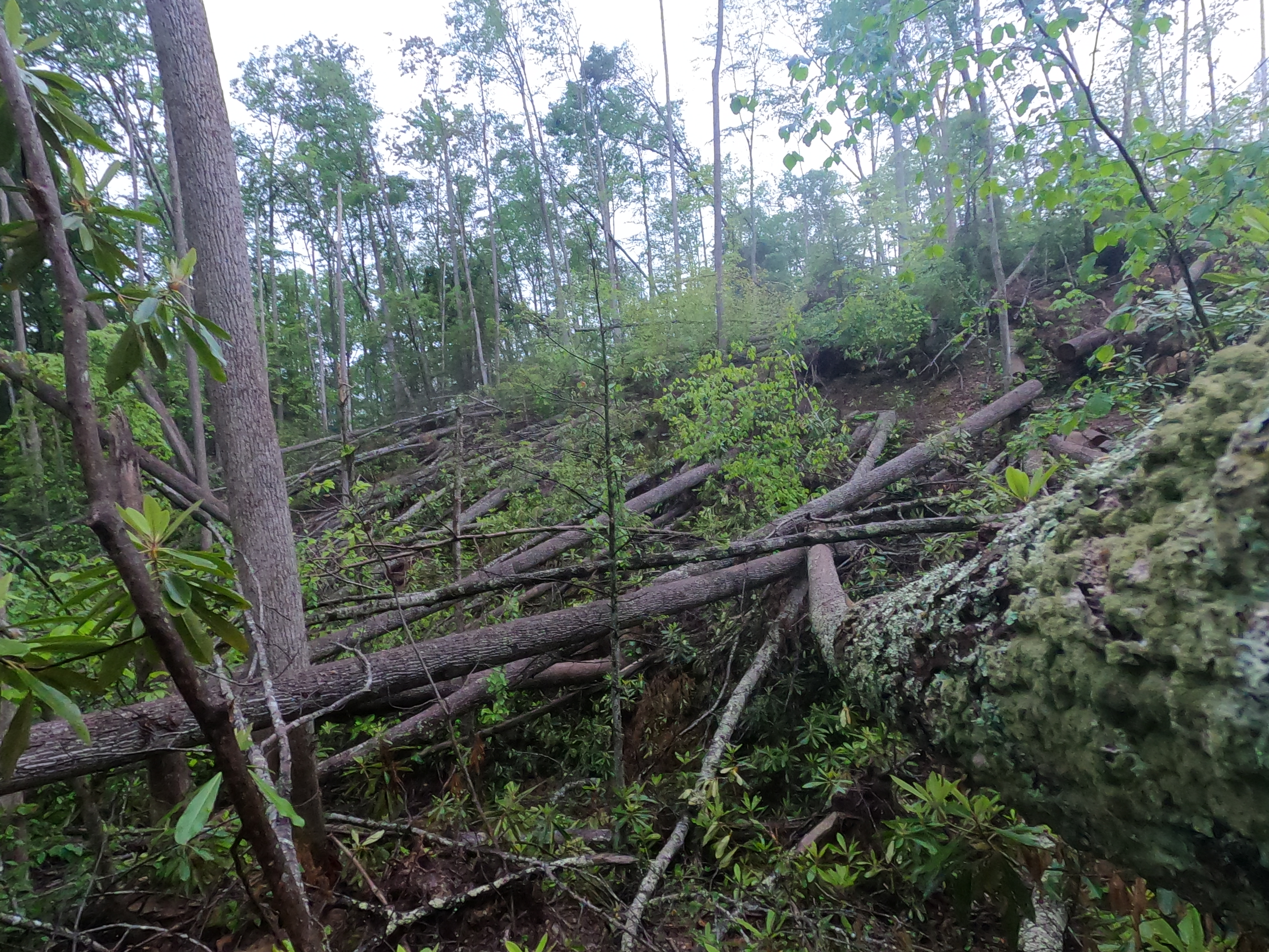 The ride from Damascus to Dickey Gap was entertaining as the two shuttle drivers had a lot of stories to tell. As we were driven up the mountain road we were surprised to see the enormous amounts of damage from Hurricane Helene in 2024. Millions of beautiful trees were on the ground and the river alongside the highway had been ravaged by flood waters. Our shuttle driver explained that just after the storm she had to use a horse to go up into the mountains to rescue a woman she had taken up there just prior to the storm. The damage was extensive and in the following days we had to crawl over and under many large trees which had fallen across the trail.
