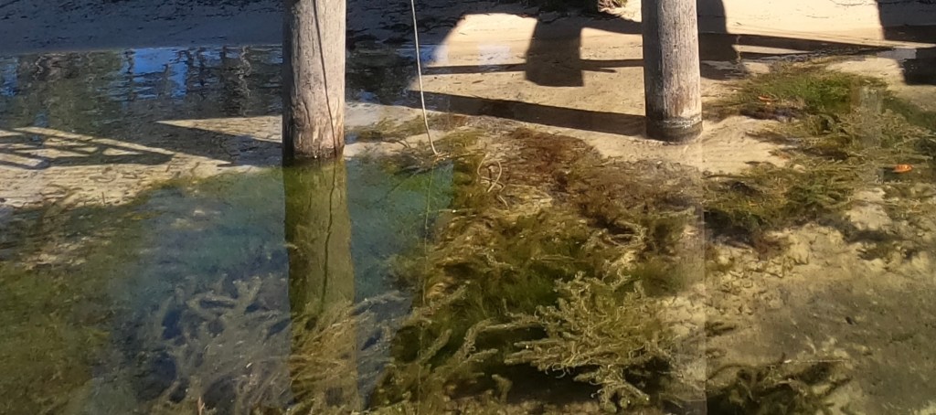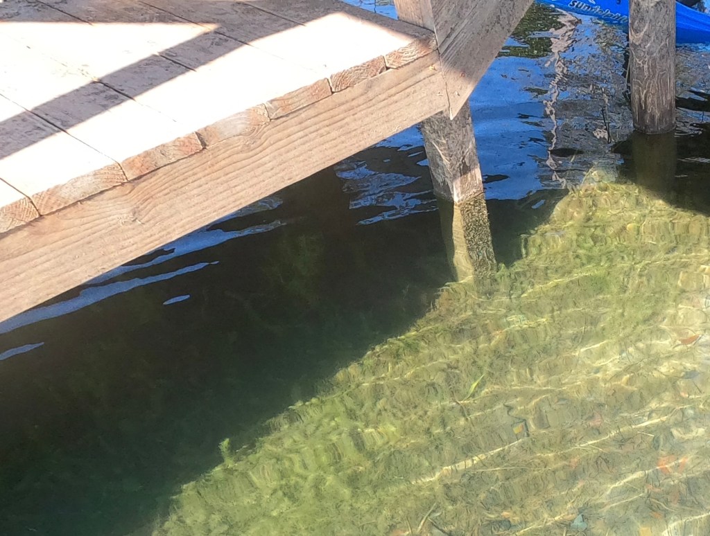 I observed a lot of new growth green grass under and around the Robinson’s dock (as had been reported). This grass was short and obviously new growth. It did NOT appear to me to be Hydrilla but probably another type of aquatic plant called Cambomba or Brittle Naiad, both of which are invasive aquatic weeds. I’m no plant expert but it did not appear to me to be Hydrilla.