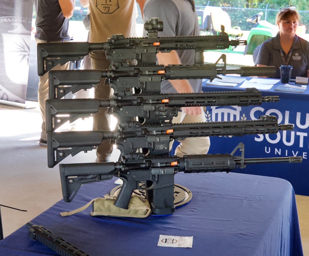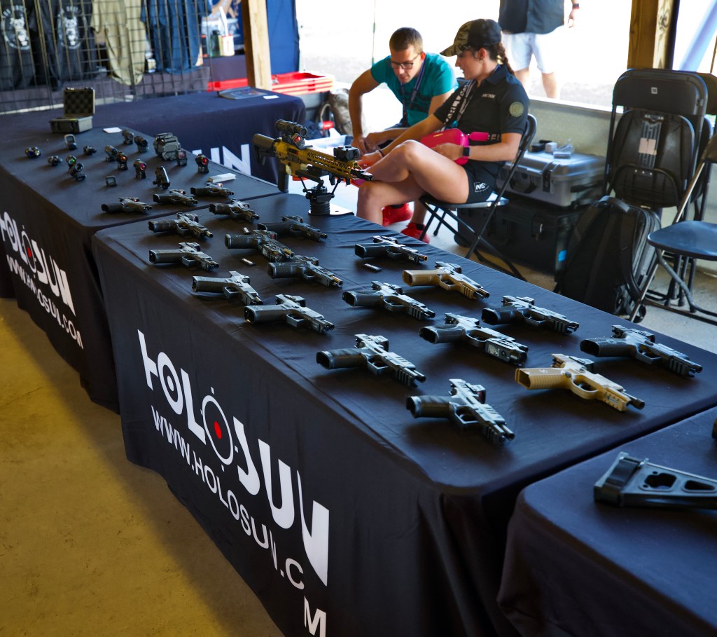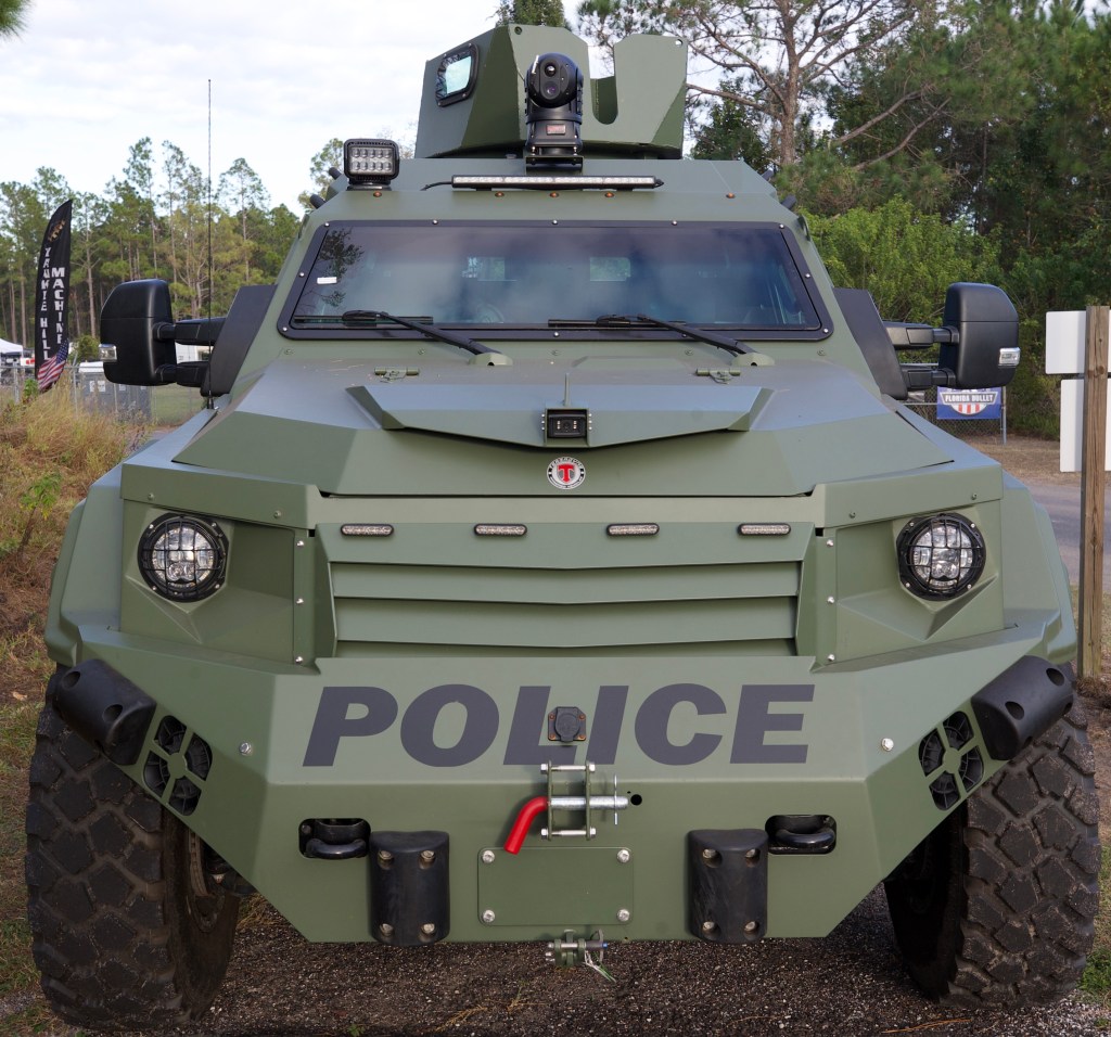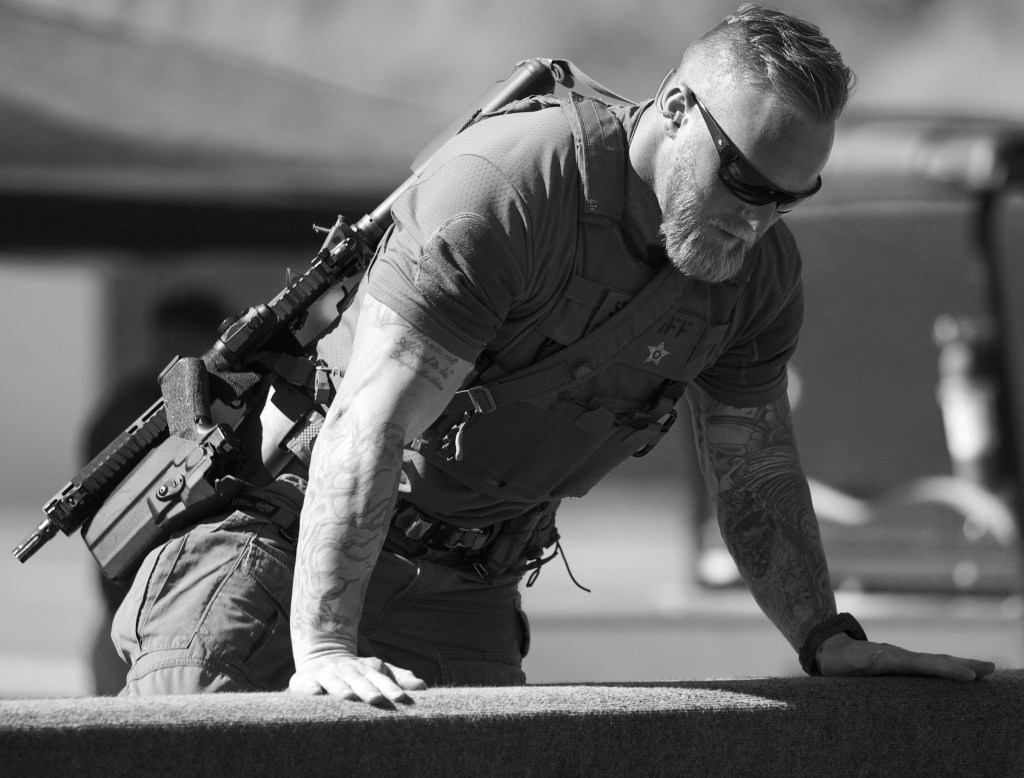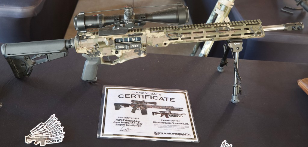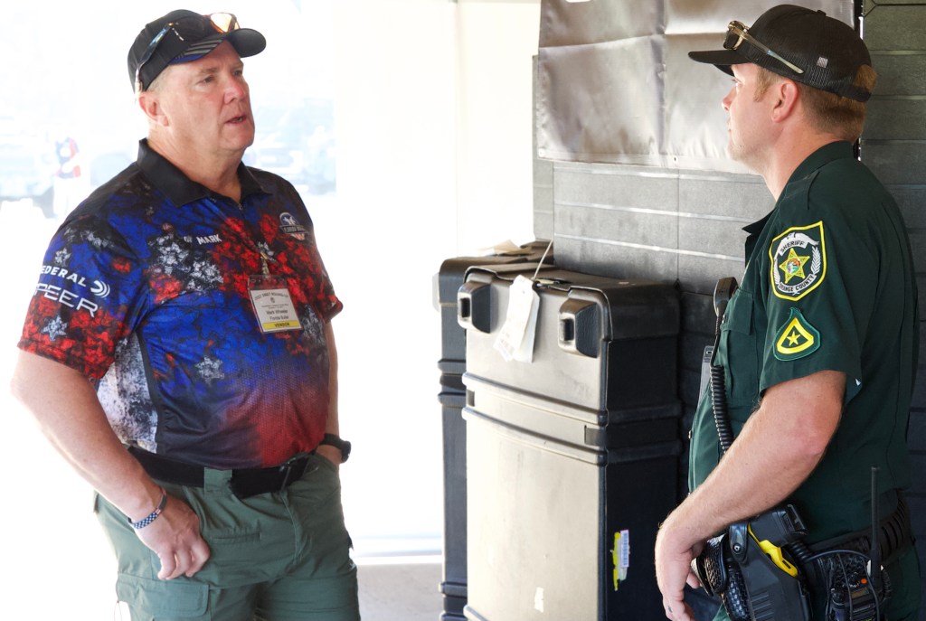 The Round Up Vendor Show featured everything Tactical! This robotic dog was walking around the show! Guns! Silencers! The vendor show was huge! First Aid equipment was on display at the Vendor’s booth. Here is a display of the latest tourniquet available on the market. There was something for everyone! The Sniper who won the Sniper competition was awarded this rifle! Spectators watch the events. Notice the baby at the bottom of the photo wearing her ears! You need it? They got it! Holosun Optics! This future SWAT Operator was enjoying the event! If only this were true…Lest we forget those who came before us…..The Citrus County Team meets before the Hostage Rescue event. Up and over…Teammates and friends…From High Ready…Sling don’t fail me now…Go! Go! Go!Tactical Vehicles were aplenty at the Roundup! All these lug nuts would make you go nuts! Ready to roll! Customized tag! Wonder how hard this was to get thru the DMV???Mark Wheeler (left) discusses handgun tactics with a young Deputy Sheriff.