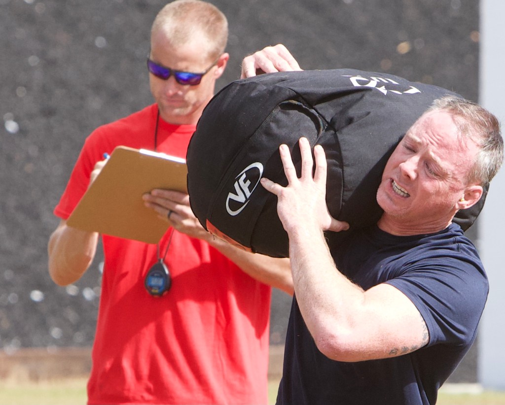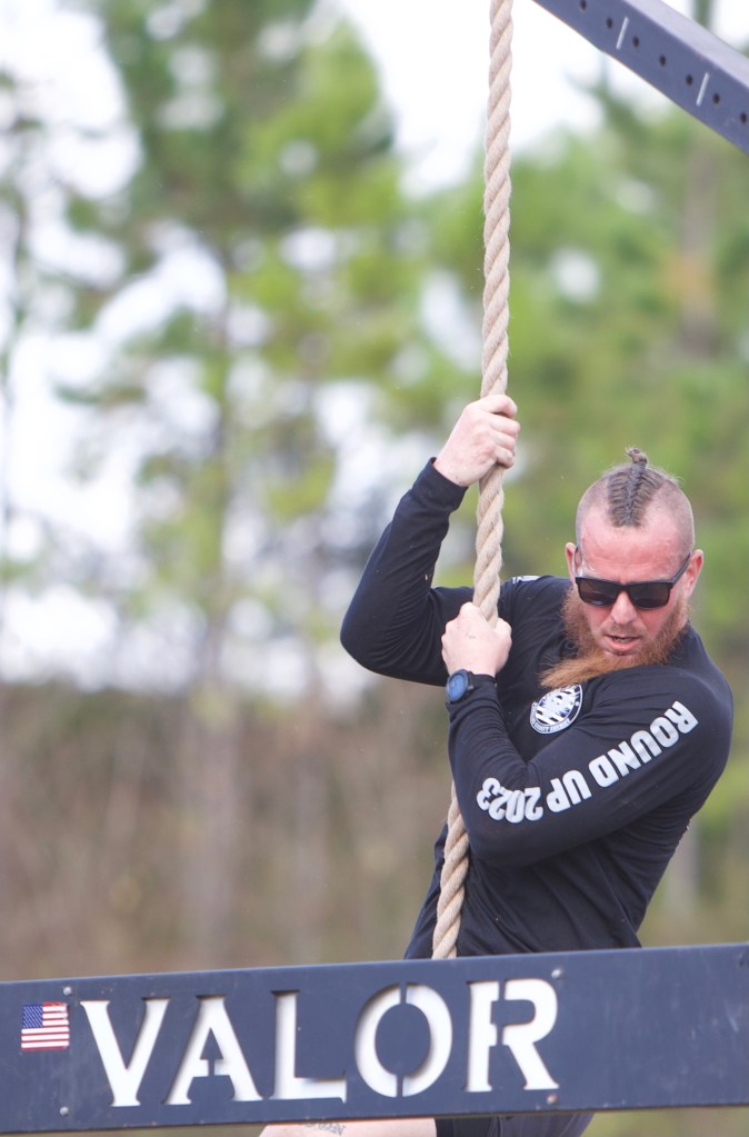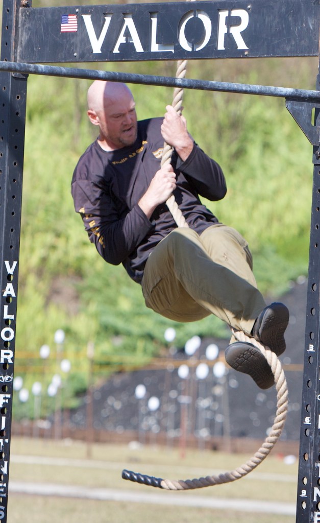 So begins the TOP SWAT COP competition! Competitors had to pull a weighted sledCompetitors must complete 10 pull ups before moving to the next station….Multiple rope climbs were the end of the line for several competitors. Running to the firing line to shoot…Competitors had to ride the stationary bikes…The heaviest sandbag was 200lbs…The 200lb bag has to be carried to a wall, taken over the wall and set into the back of an ATV.