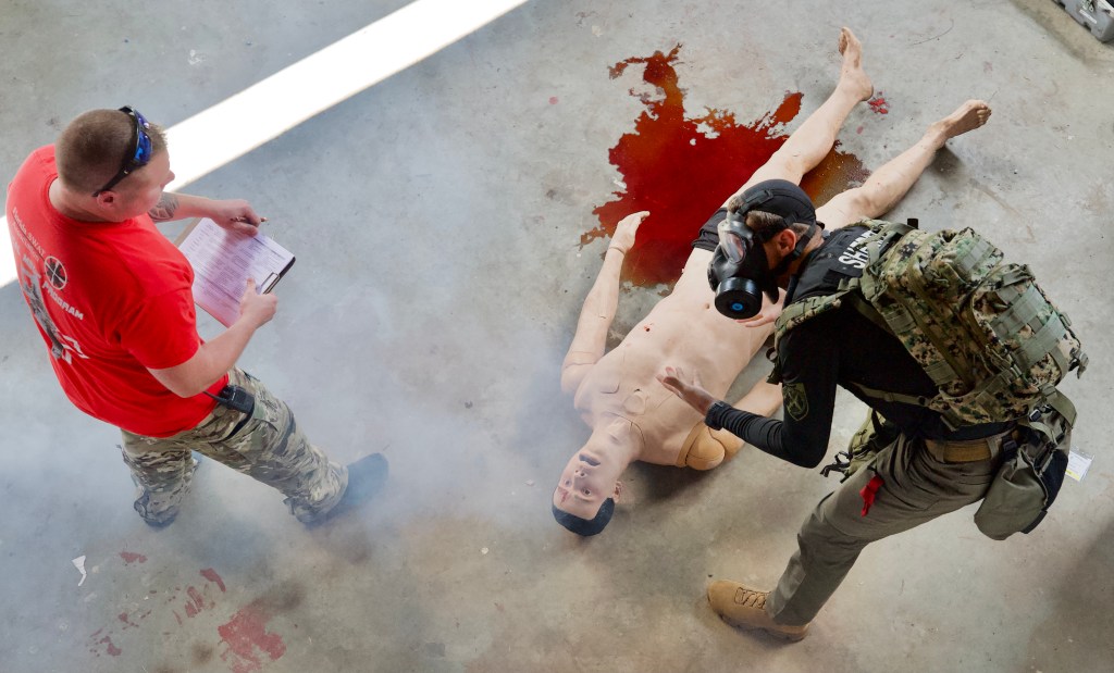 Thursday was individual events and one of these was the SWAT Medic competition. Before the event, I met and spoke with the coordinators and judges and they were more than willing to allow me to watch and photograph the event. The event started with the medics dragging a life-sized dummy in a sled for about 100 yards and then they entered the “shoot house” which was a two-story building with a catwalk above for judges to watch the competition below. This event was intense. The Medic had to work his way thru the house, assessing victims as he went, wearing a gas mask while a smoke machine clouded his way and sirens, gunfire, and radio traffic were blasted in the house. Once he got to the surviving victim, he had to determine the victim’s injuries and administer life-saving first aid techniques. The victim wasn’t a live human being but a robotic mannequin that was incredibly life-like and controlled by an operator upstairs. The robot registered a pulse and breathed. His eyes moved and his “wounds” bled as blood pooled on the ground from several wounds on his body. The controller told me that the technology for these robots originated from the war in Iraq and Afghanistan as Corpsmen and Field Medics worked to treat the wounded. These robots simulated the injuries sustained on the battlefield. Unfortunately, they also apply to the situations our First Responders deal with on a daily basis in our own Country. These robots provide real life scenarios that allow our First Responders to train and respond when the time comes. The Medics did an outstanding job under the watchful eyes of several judges who graded his every move and timed his efforts. Even though I was only an observer with a camera watching from above, this event was so intense it had me amped up and I found myself wanting to jump in and help. It was amazing to watch.