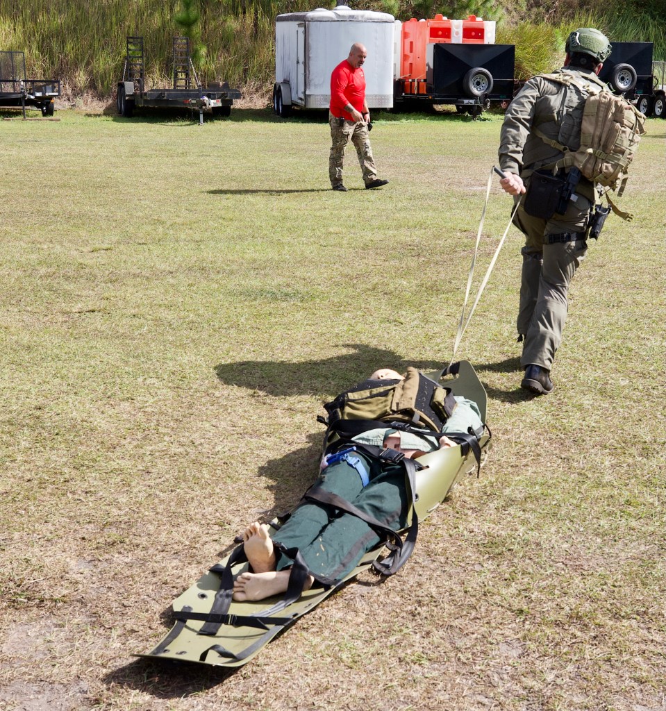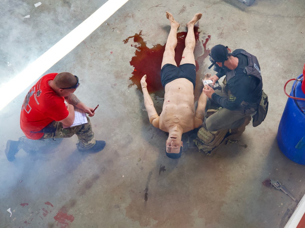 The event begin with a 100 yard dummy drag. The event has just begun…The Medic begins to assess the victim as he bleeds out from gunshot wounds. Notice the pistol on the floor. Three Judges watch the Medic closely as he works to stop the bleeding. Additional Judges watch from above. The controller’s computer tells him how much blood the victim has lost and if the bleeding isn’t stopped soon….the victim dies. The Medic explains to the Judge what he’s about to do. This Medic opts to move the victim to a safer location within the house in order to treat him. The victim is bleeding profusely and time is critical. Again notice the gun on the floor.