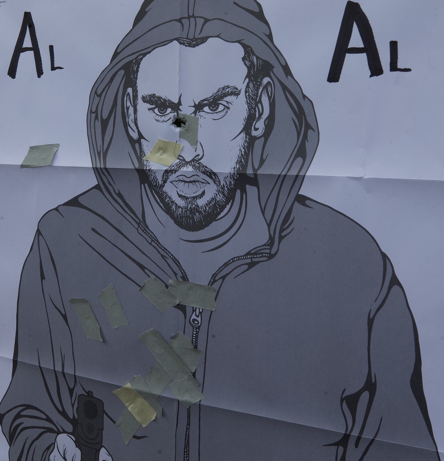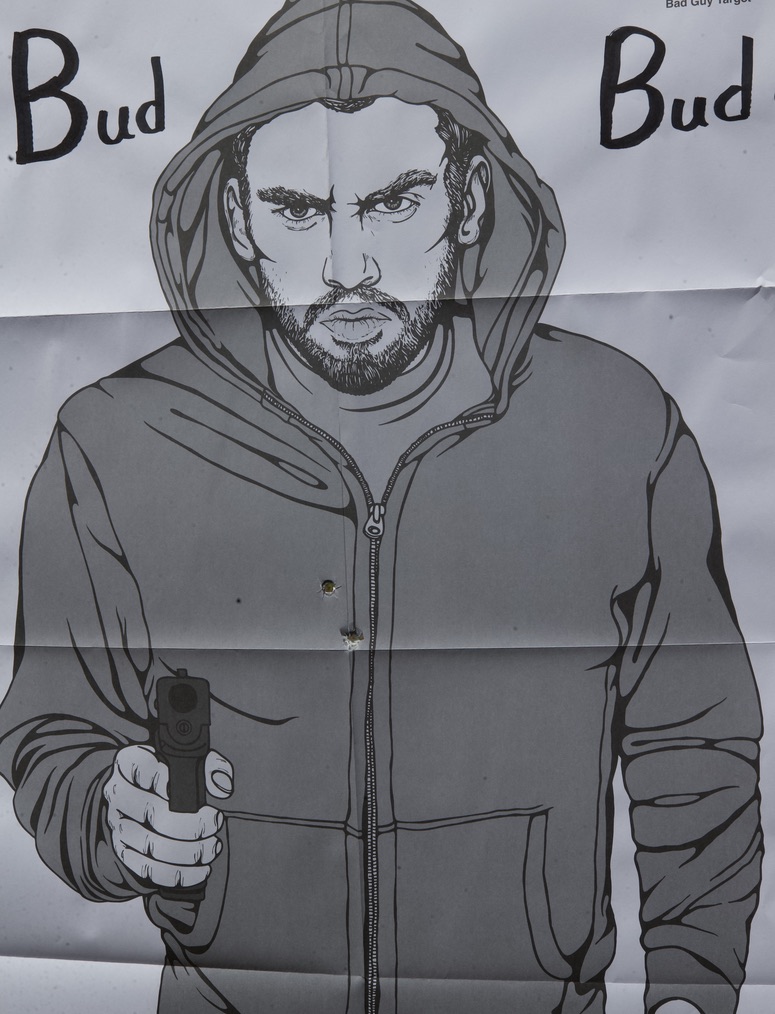 The family of Orange County Deputy Sheriff Michael Milmerstadt gathers around a cut-out of him on the range at the beginning of the Top Swat Cop Event at Roundup. Deputy Milmerstadt was fatally injured while training. His mother is standing to his right. The Top Swat Cop Event was named after Deputy Milmerstadt the night before this event.